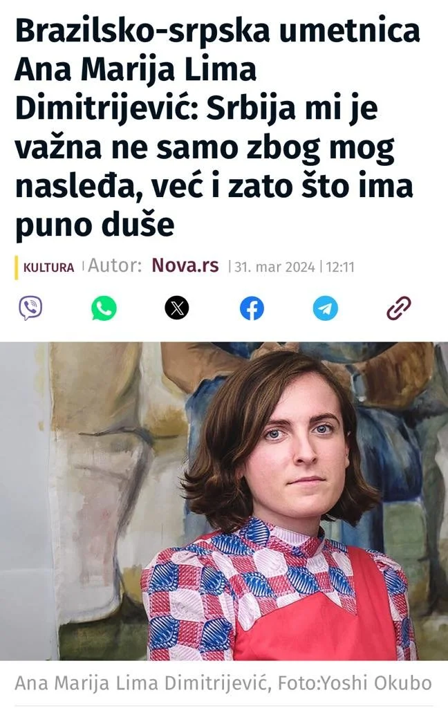 "Brazilian-Serbian artist Ana Marija Lima Dimitrijević: Serbia is important to me not only because of my heritage, but also because it has a lot of soul", article by Nikola Marković for Nova.rs.